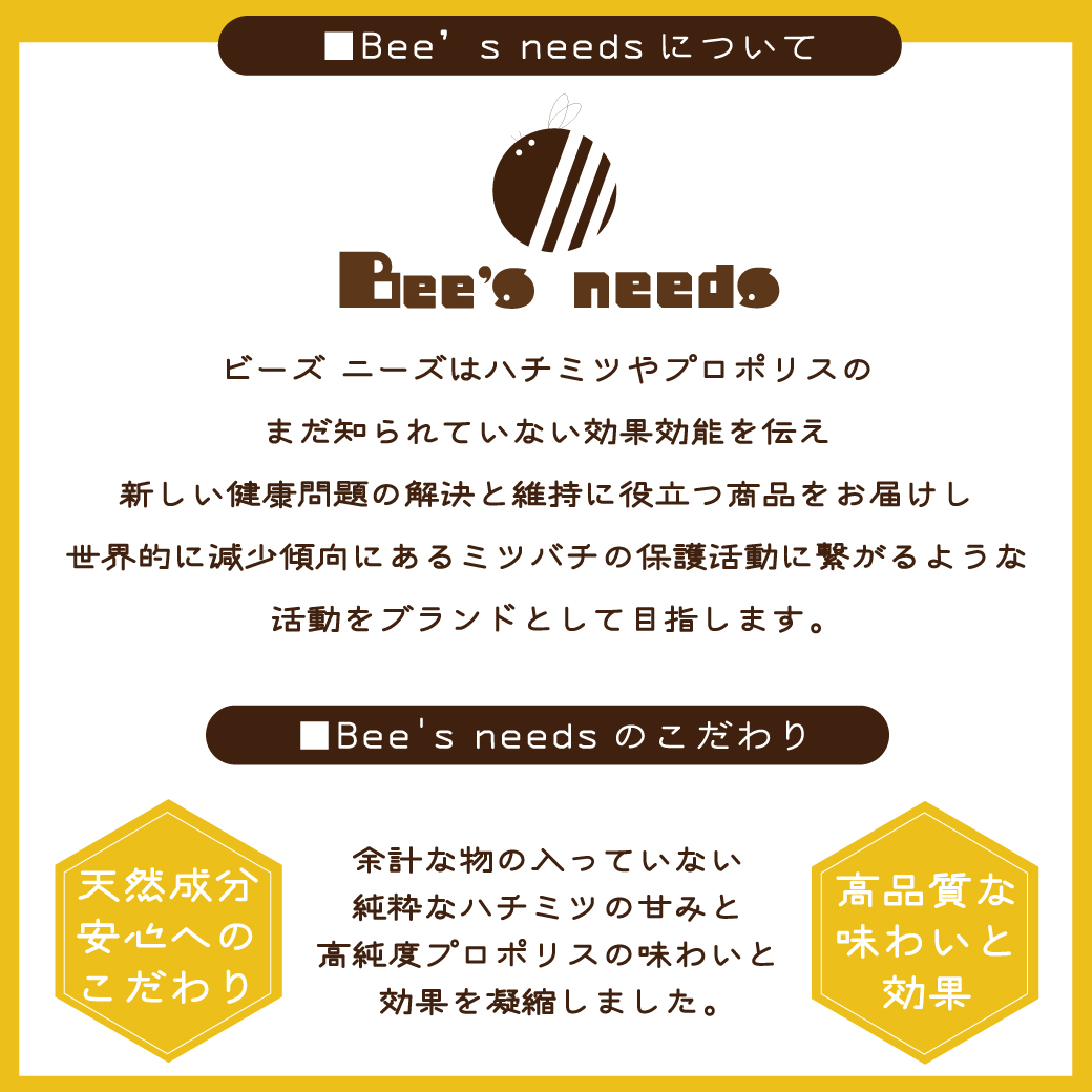 又、『Bee‘s needs』(ビーズニーズ)は主にハチミツやプロポリスのまだ知られていない効果効能を伝え、新しい健康問題の解決と維持に役立つ商品をお届けし、世界的に減少傾向にあるミツバチの保護活動に繋がるような活動をブランドとして目指します。
